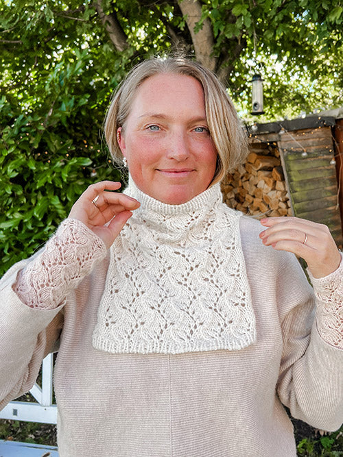Sakura Neck Warmer is knitted from the bottom up, starting with the front and back pieces knitted flat separately and then joined into a round and finished on circular needles.