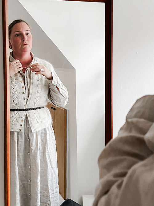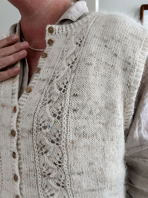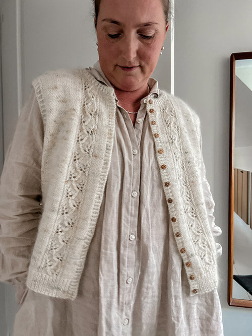 Sakura Open Vest is knitted from the bottom up, so the sakura pattern faces the right way. Shoulders from the front and back are sewn together with invisible stitches.